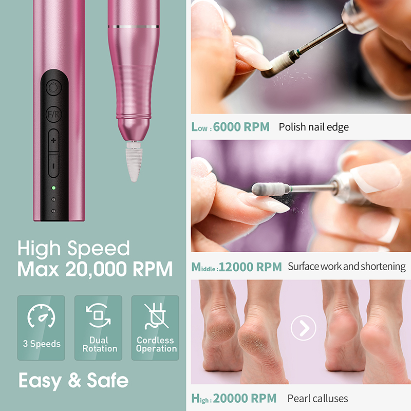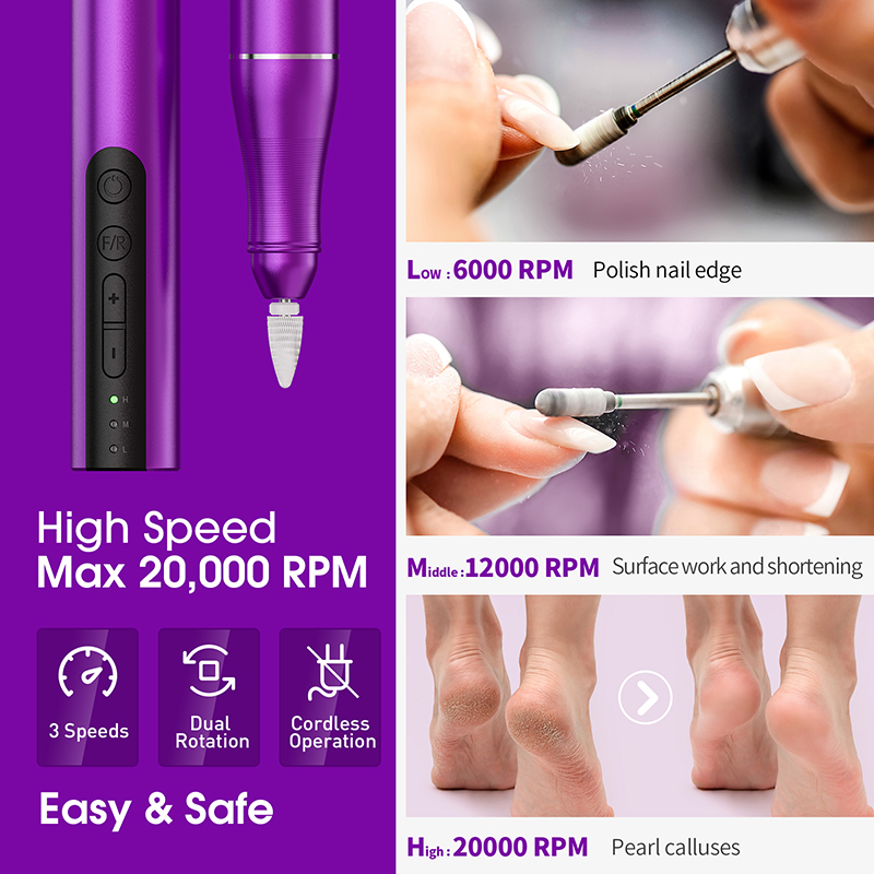 ऐक्रेलिक नाखूनों के लिए नेल ड्रिल को हल्के वजन (85 ग्राम) के लिए डिज़ाइन किया गया है और यह आपके पर्स या कपड़ों की जेब में फिट हो सकता है। यह एक यूएसबी चार्जिंग केबल के साथ भी आता है जिसे चार्ज करने के लिए किसी भी यूएसबी डिवाइस में आसानी से प्लग किया जा सकता है, जिससे आपके लिए कभी भी और कहीं भी अपने नाखूनों की देखभाल का आनंद लेना सुविधाजनक हो जाता है।