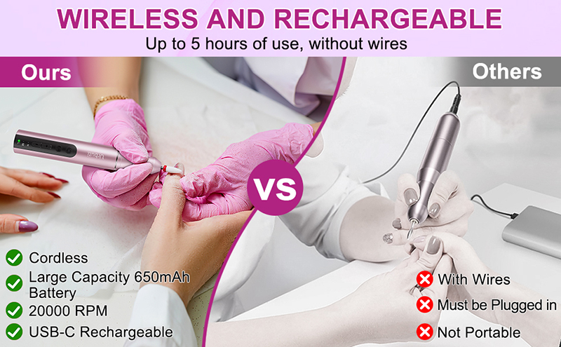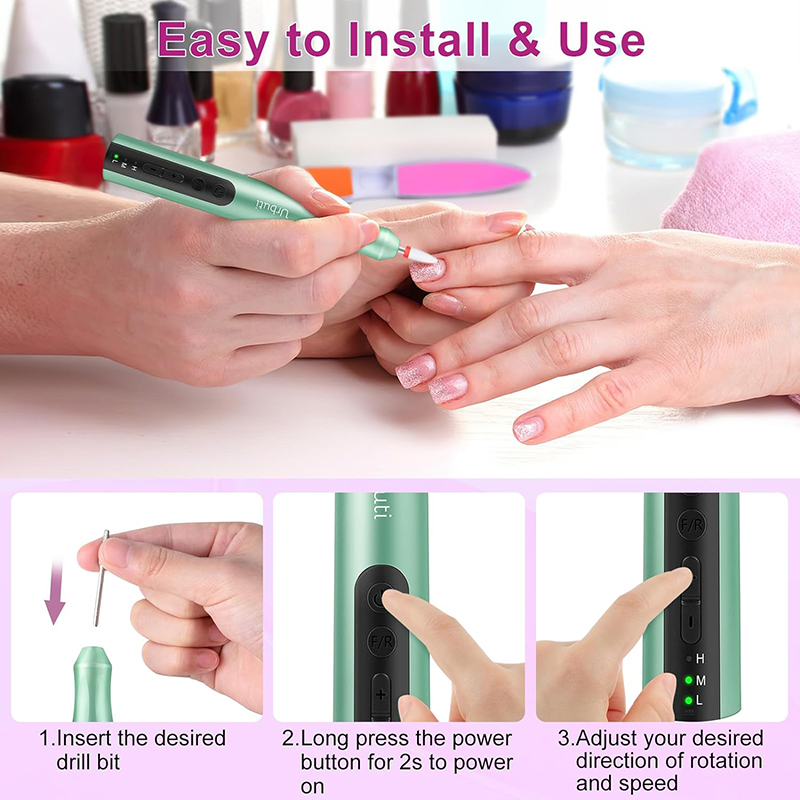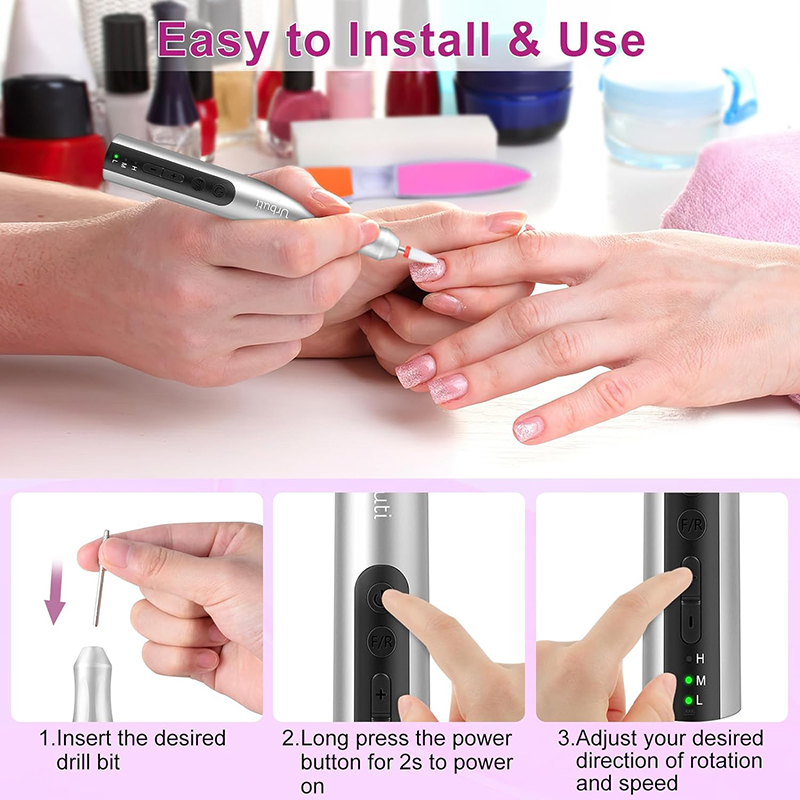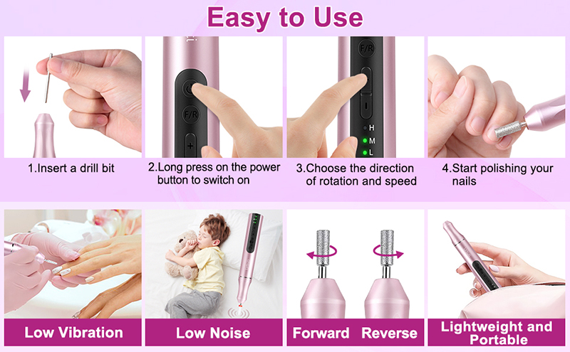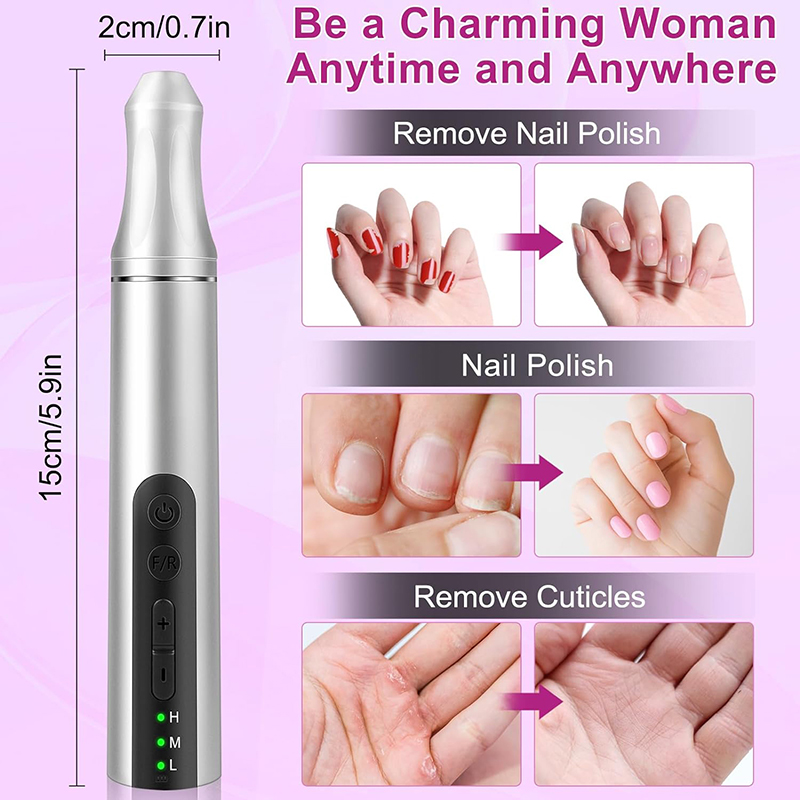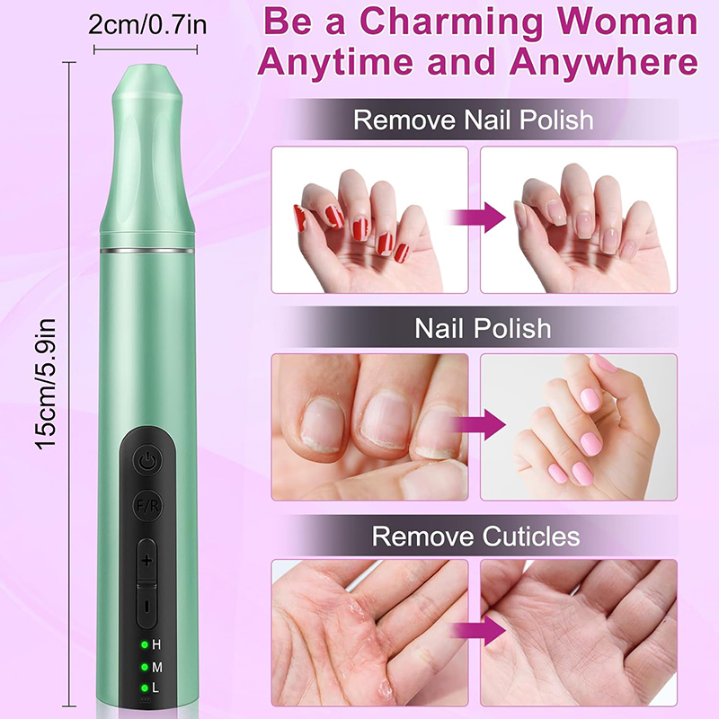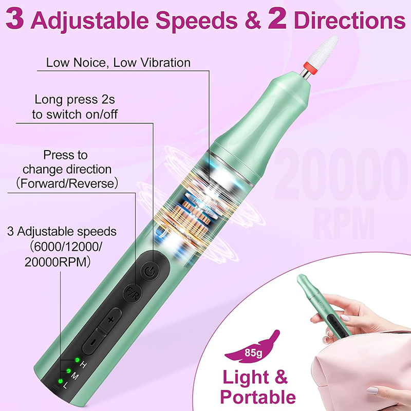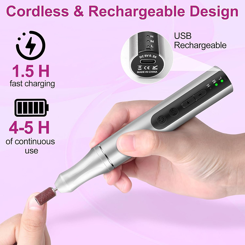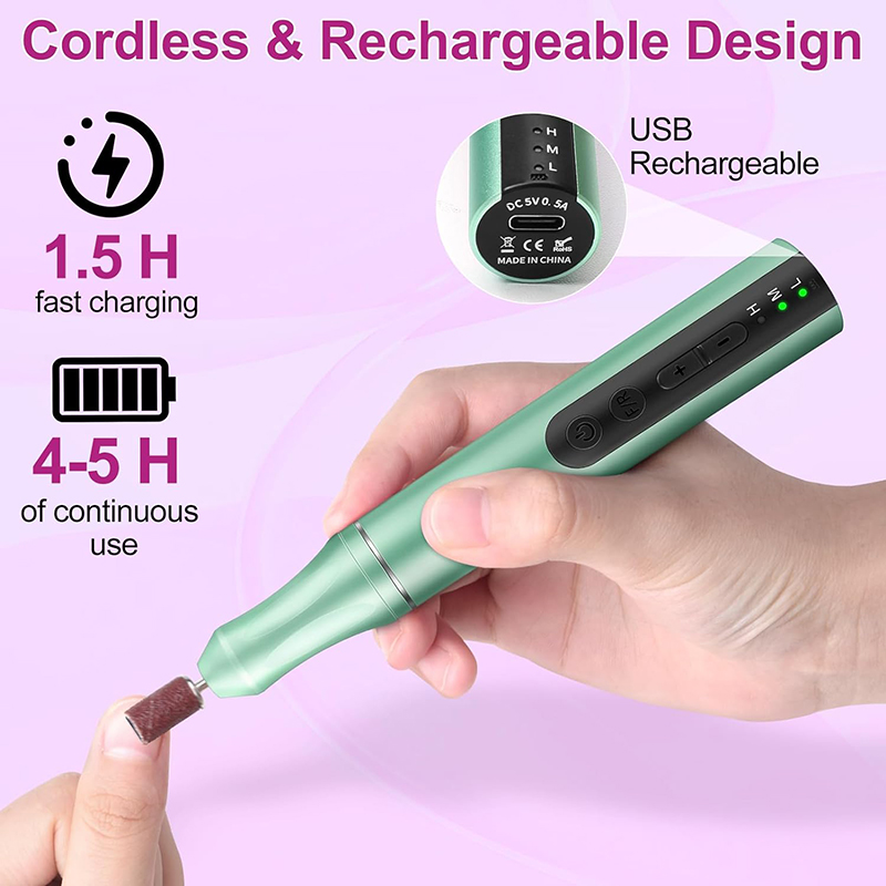 ऐक्रेलिक नाखूनों के लिए नेल ड्रिल को हल्के वजन (85 ग्राम) के लिए डिज़ाइन किया गया है और यह आपके पर्स या कपड़ों की जेब में फिट हो सकता है। यह एक यूएसबी चार्जिंग केबल के साथ भी आता है जिसे चार्ज करने के लिए किसी भी यूएसबी डिवाइस में आसानी से प्लग किया जा सकता है, जिससे आपके लिए कभी भी और कहीं भी अपने नाखूनों की देखभाल का आनंद लेना सुविधाजनक हो जाता है।