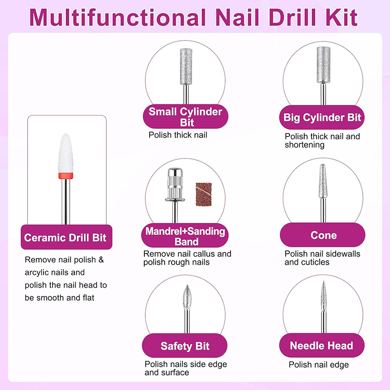 नेल ड्रिल मशीन में 6 स्टेनलेस स्टील नेल ड्रिल बिट, 1 सिरेमिक ड्रिल बिट और 36 इंटरचेंजेबल सैंडिंग स्ट्रिप्स शामिल हैं। मैनीक्योर पेडीक्योर किट का उपयोग मैनीक्योर, पेडीक्योर, पॉलिशिंग, शेपिंग, क्यूटिकल ग्राइंडिंग, ऐक्रेलिक/जेल नेल रिमूवल या नेल ब्यूटी के लिए किया जा सकता है। एक्सेसरीज के साथ पूरा और उपयोग में आसान, नेल आर्ट के शुरुआती लोगों के लिए एकदम सही!