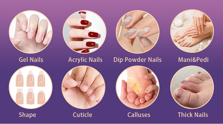 【Rechargeable and Wireless】The nail filer electric is equipped with a 2000 mAh rechargeable battery that can maintain continuous cordless operation for more than 6 hours on a full charge. Electric nail filer for adults let you enjoy hand and foot care wherever you want without the hassle of cables.
