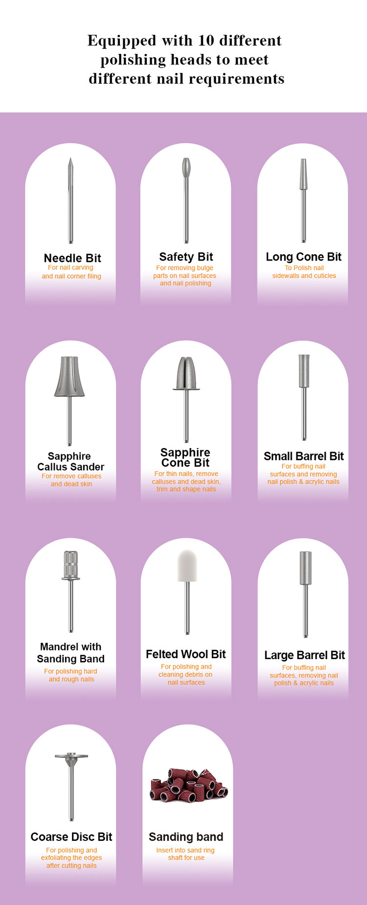 【10 SPEED & Dual Rotations】Experience the power of our nail file electric drill kit, featuring 10 progressive speed settings and versatile clockwise and counter-clockwise rotations. The efile nail dril guarantees precise filing on thick fingernails and toenails and is tailored for all skin types.