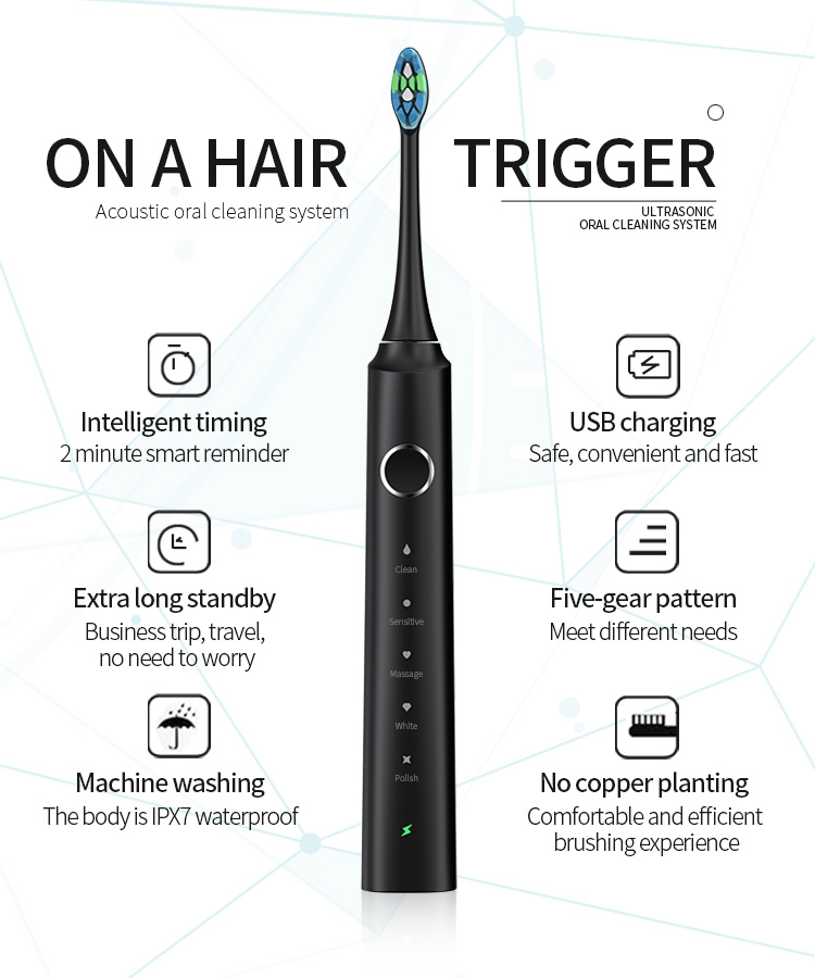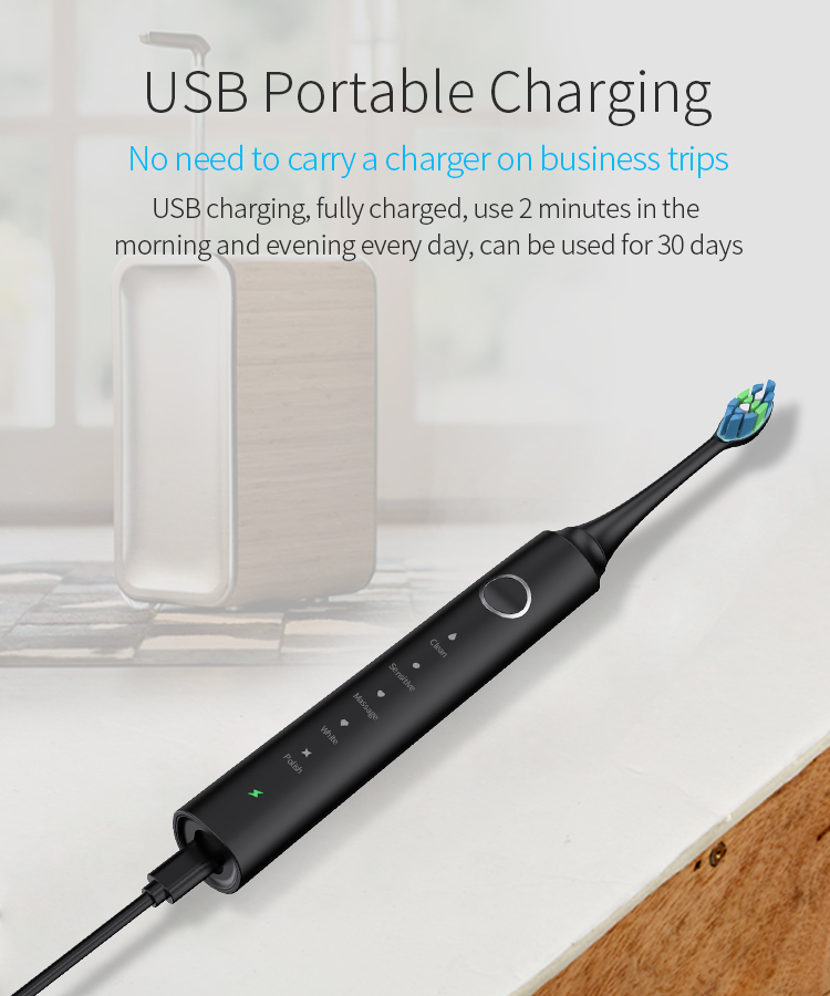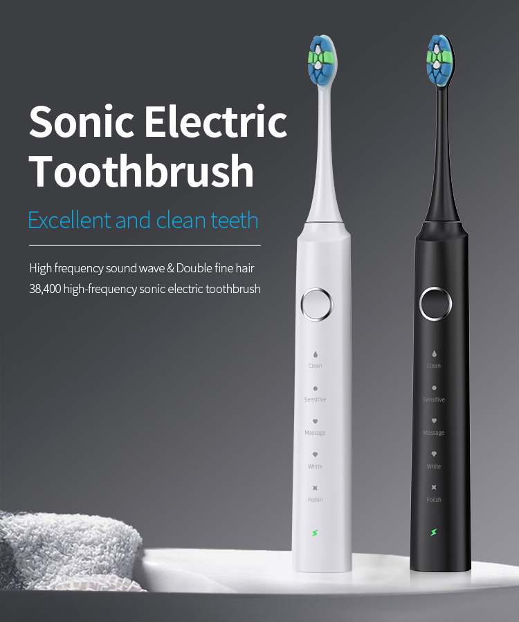 - 5 उच्च प्रदर्शन ब्रशिंग मोड - स्वच्छ (कोमल), सफेद (मजबूत), पॉलिश (मजबूत उलट आवृत्ति), हल्का (कोमल उलट आवृत्ति) और संवेदनशील (नरम) दांतों और मसूड़ों की विभिन्न स्थितियों के अनुरूप, ताकि आप अपनी प्राथमिकताओं और दंत चिकित्सक की सिफारिशों के अनुसार विभिन्न मोड चुन सकें।