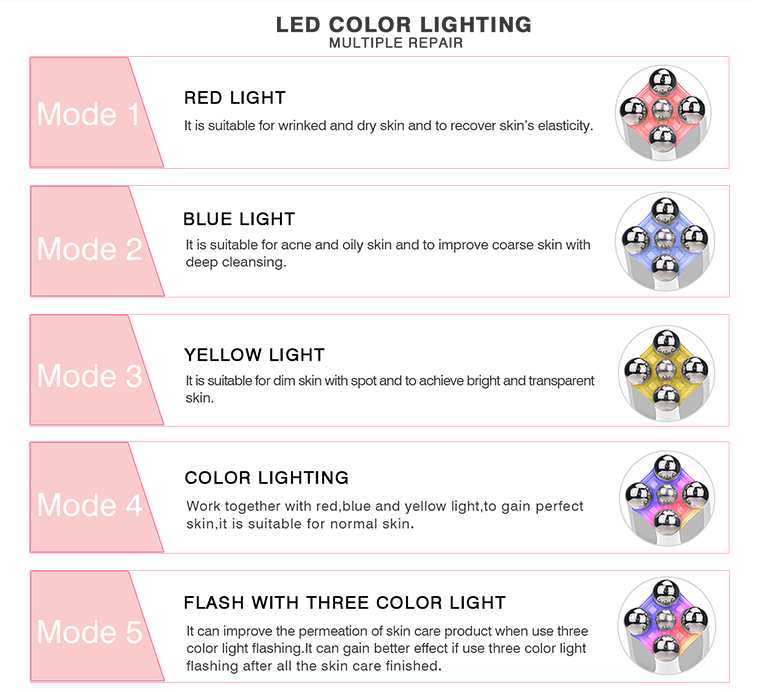 6-इन-1 स्किनकेयर रूटीन --RF ने दैनिक स्किनकेयर रूटीन के अनुसार 6 मोड डिज़ाइन किए हैं। वे हैं #पेनेट्रेशन जो त्वचा के अवशोषण को बेहतर बनाता है, #क्लीनिंग जो चेहरे की पूरी तरह से सफाई करता है, #स्पेशल जो आँखों की देखभाल करता है, #लिफ्टिंग जो त्वचा को कसता और मजबूत बनाता है, और #कूल जो त्वचा को आराम और स्टरलाइज़ करता है।