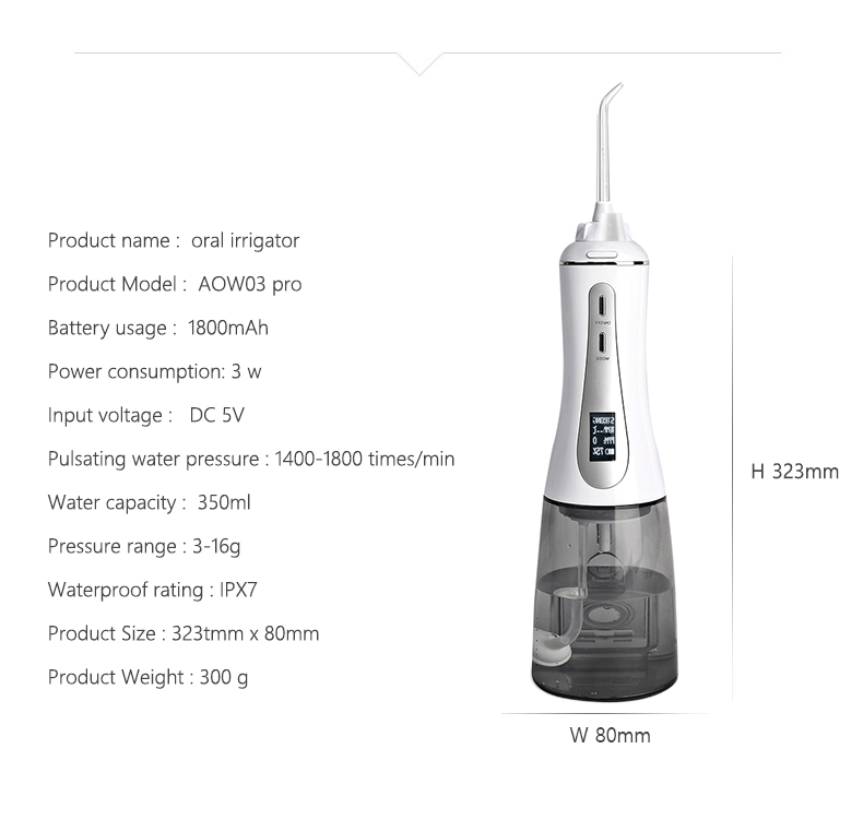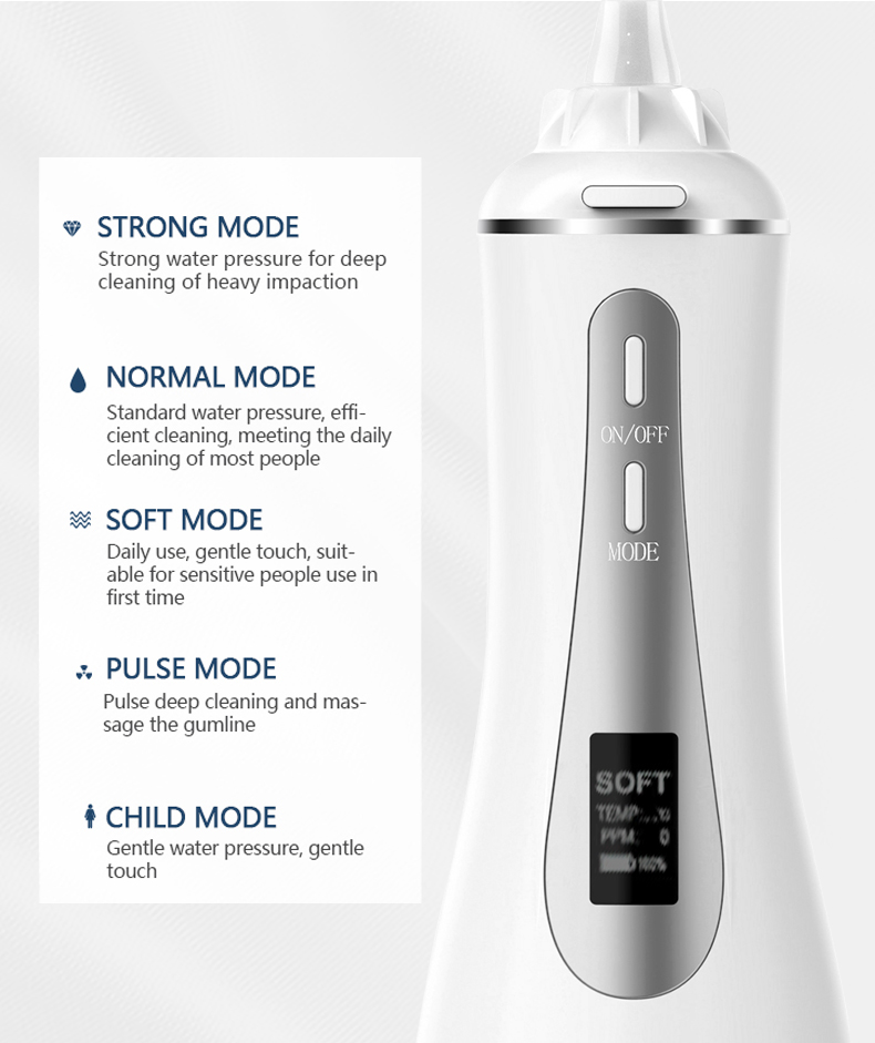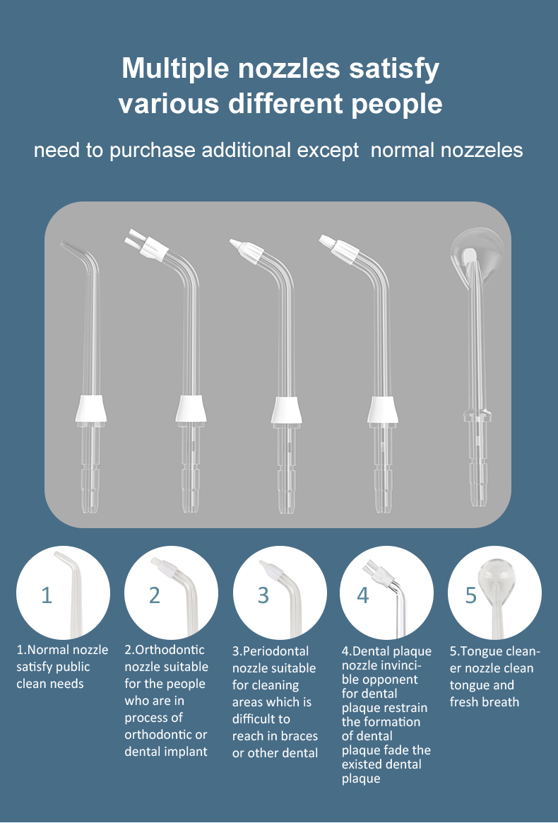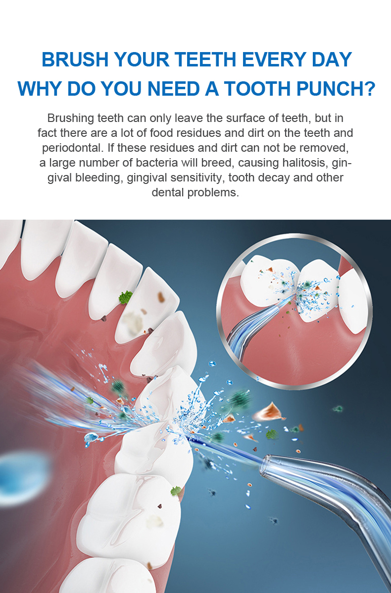 यह वॉटर डेंटल पिक 1400-1800 बार प्रति मिनट की दर से उच्च जल दबाव पल्स प्रदान करता है, जो दांतों की गहरी सफाई के लिए 99.9% डेंटल प्लाक को प्रभावी ढंग से हटाता है। यह वॉटर डेंटल पिक मसूड़ों की मालिश करता है, रक्त परिसंचरण को बढ़ावा देता है, और खराब सांस, ऑर्थोडोंटिक दांतों जैसी मौखिक समस्याओं का समाधान करता है