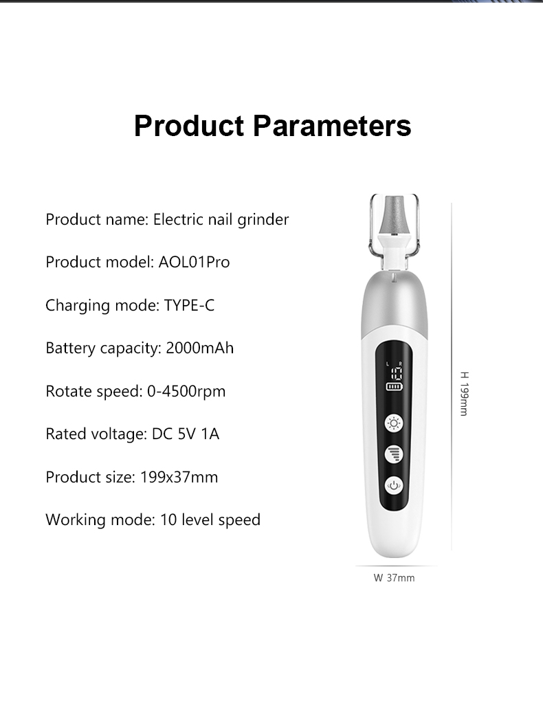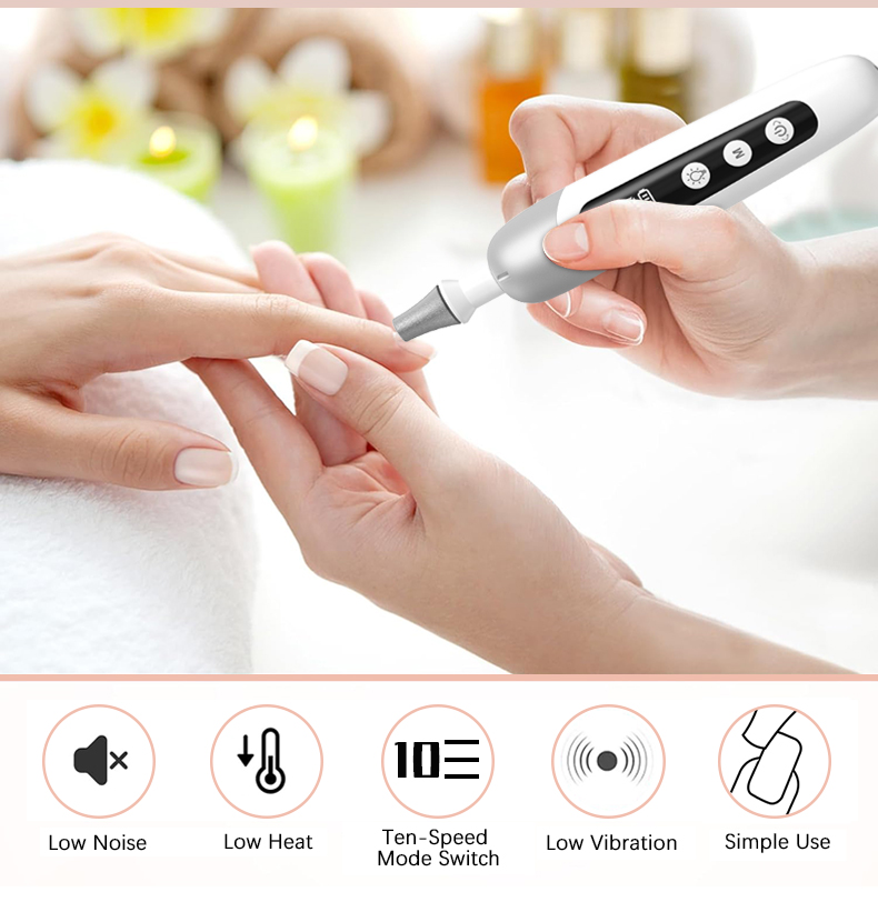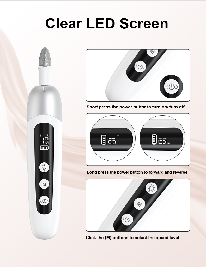 - अभिनव एलईडी डिस्प्ले: आसानी से वांछित सेटिंग्स को आसानी से नेविगेट करें। एलईडी डिस्प्ले बैटरी की स्थिति, गति वरीयता और रोटेशन सेटिंग्स को सहज संचालन के लिए इंगित करता है। इलेक्ट्रिक नेल फाइल मशीन एक एकीकृत एलईडी-लाइट से भी सुसज्जित है जो हाथों और पैरों के क्षेत्रों को रोशन करती है