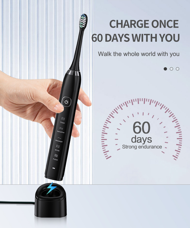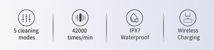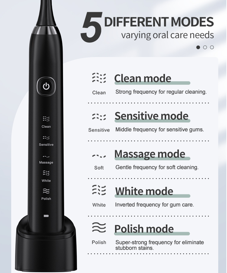 - 5 उच्च प्रदर्शन ब्रशिंग मोड - स्वच्छ (कोमल), सफेद (मजबूत), पॉलिश (मजबूत उलट आवृत्ति), हल्का (कोमल उलट आवृत्ति) और संवेदनशील (नरम) दांतों और मसूड़ों की विभिन्न स्थितियों के अनुरूप, ताकि आप अपनी प्राथमिकताओं और दंत चिकित्सक की सिफारिशों के अनुसार विभिन्न मोड चुन सकें।