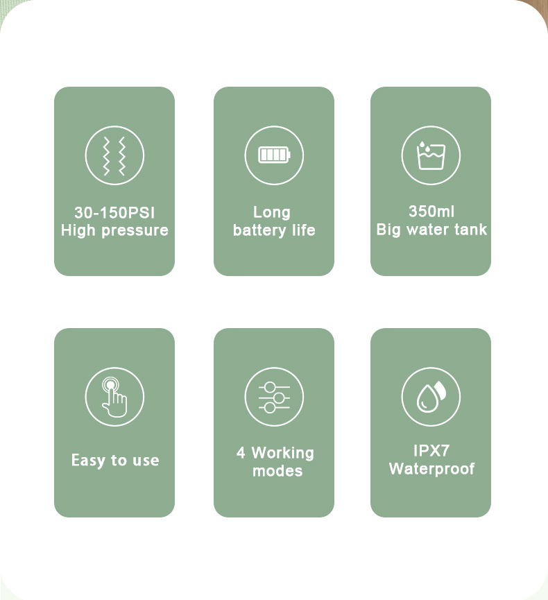 हमारा वायरलेस वॉटर डेंटल पिक बेहतरीन वॉटरप्रूफिंग से युक्त है, जिससे स्नान के दौरान आसानी से सफाई और सुरक्षित उपयोग किया जा सकता है।