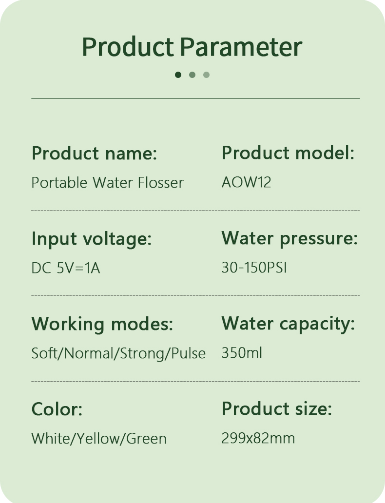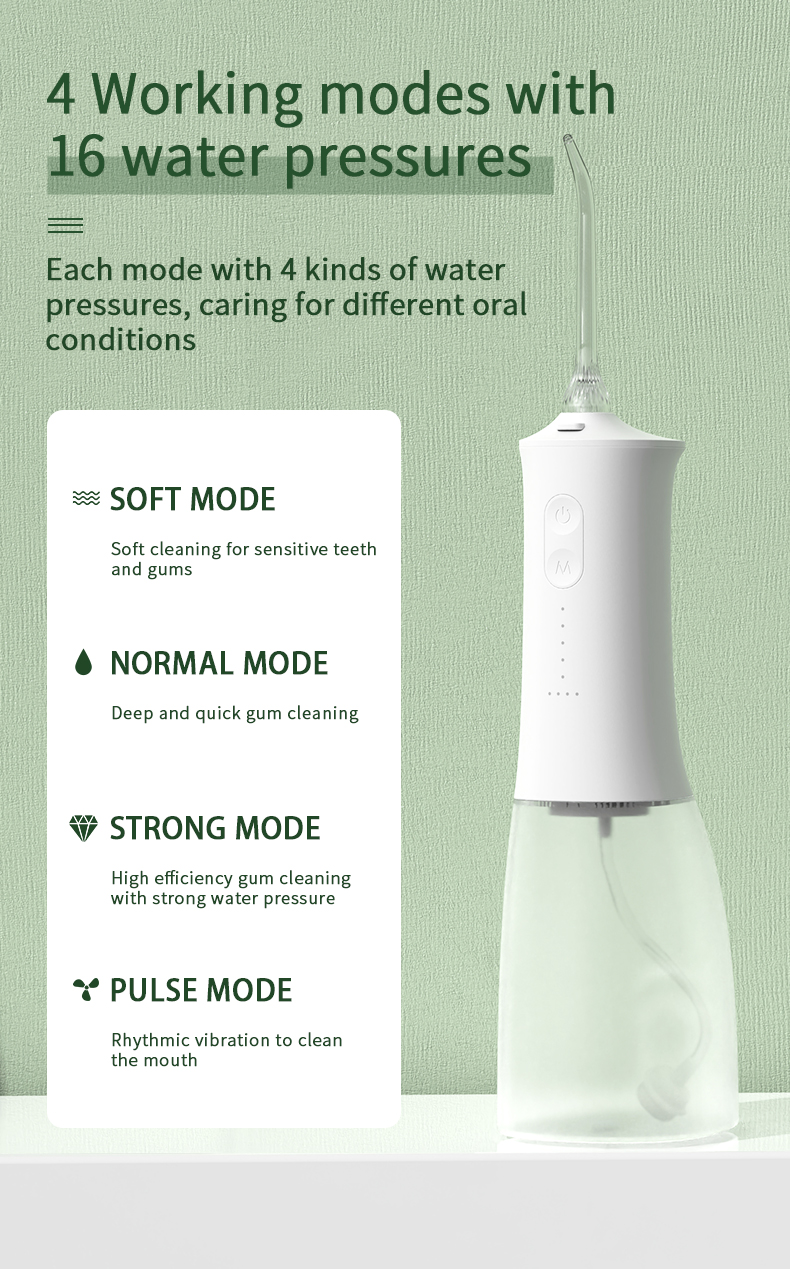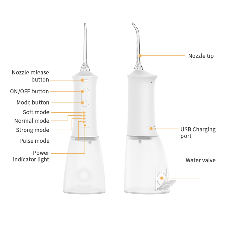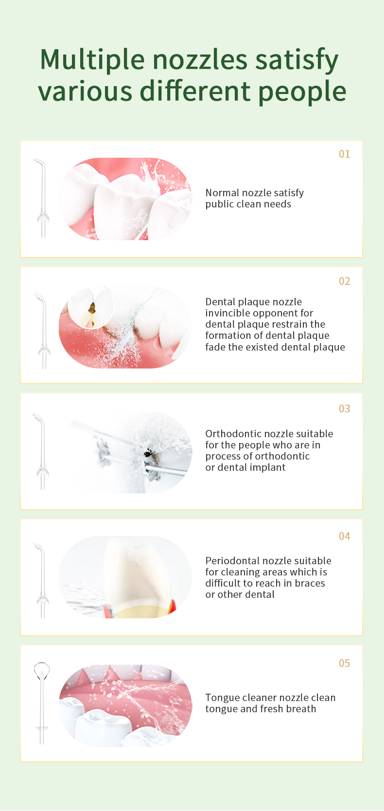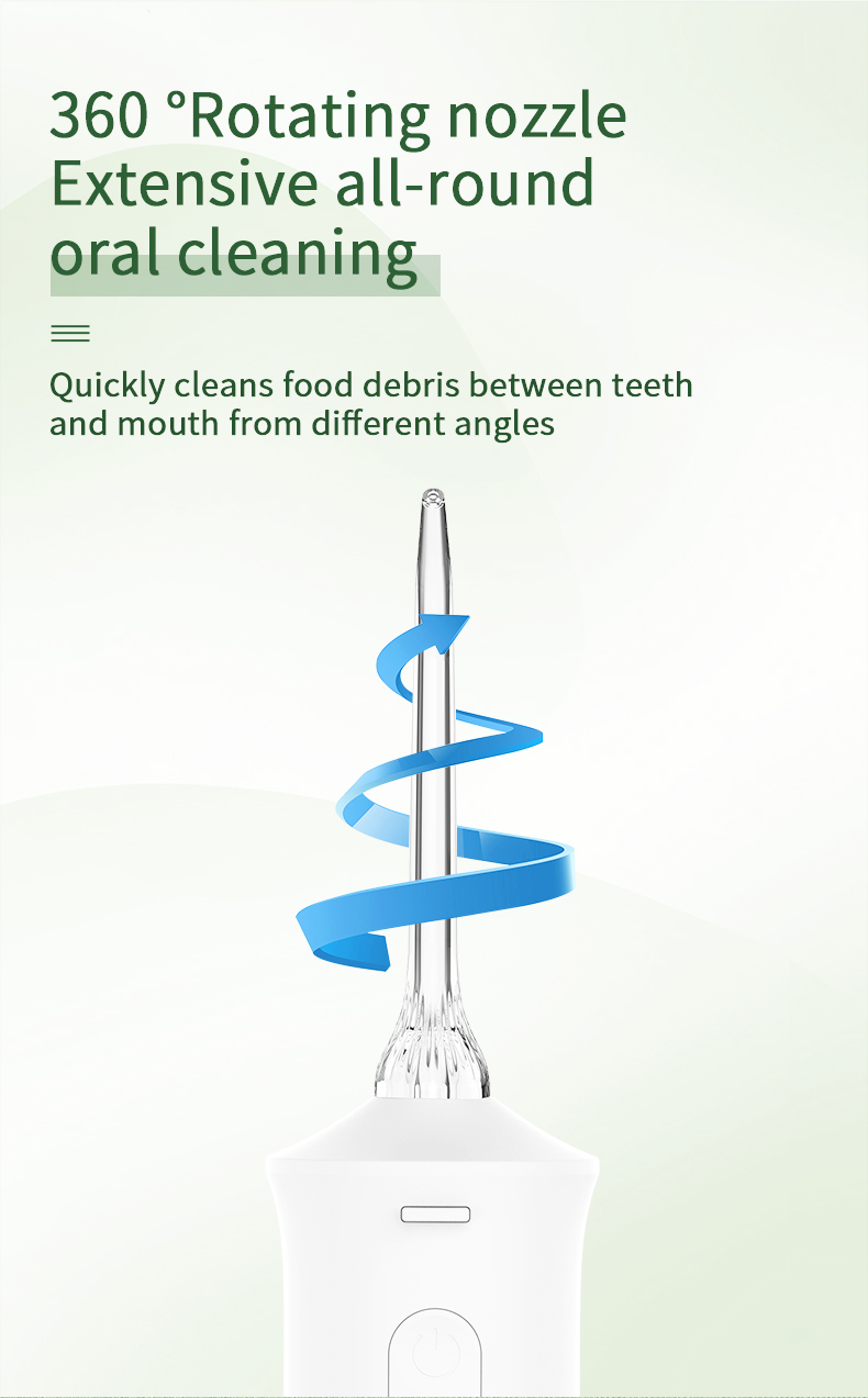 यह वॉटर डेंटल पिक 1400-1800 बार प्रति मिनट की दर से उच्च जल दबाव पल्स प्रदान करता है, जो दांतों की गहरी सफाई के लिए 99.9% डेंटल प्लाक को प्रभावी ढंग से हटाता है। यह वॉटर डेंटल पिक मसूड़ों की मालिश करता है, रक्त परिसंचरण को बढ़ावा देता है, और खराब सांस, ऑर्थोडोंटिक दांतों जैसी मौखिक समस्याओं का समाधान करता है