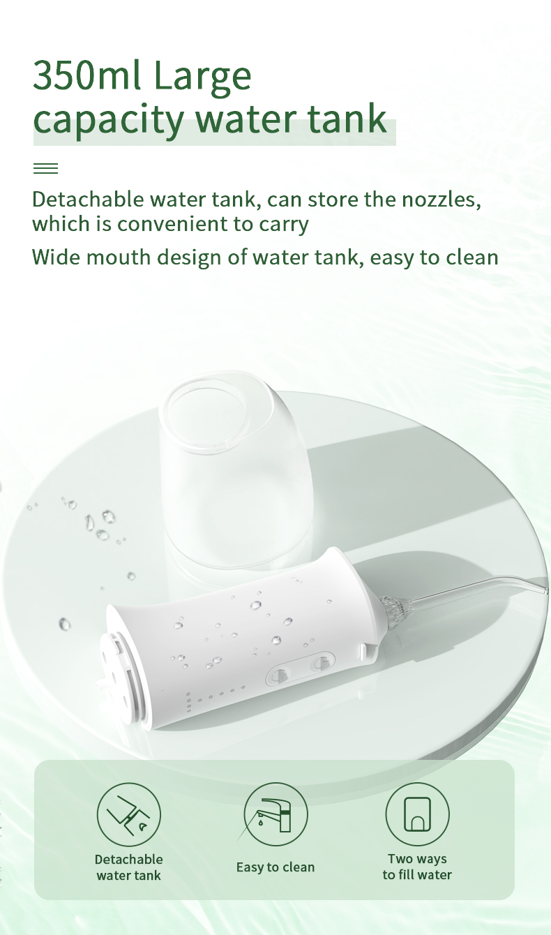 इस वॉटर डेंटल फ़्लॉसर में एक उन्नत 350ml पानी की टंकी है, जो अन्य पुराने मॉडलों की क्षमता से दोगुनी है, जिससे बार-बार पानी भरने की ज़रूरत नहीं पड़ती और आपकी मौखिक सफ़ाई अधिक सुविधाजनक और कुशल हो जाती है
